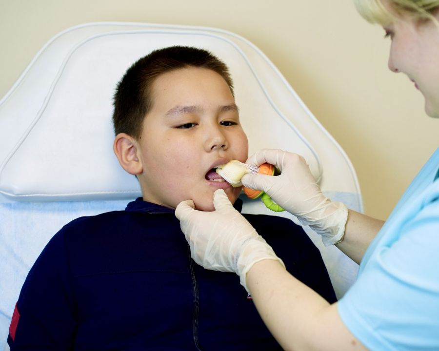 С помощью индивидуального тренажера логопед учит ребенка самостоятельно пережевывать пищу и глотать ее.